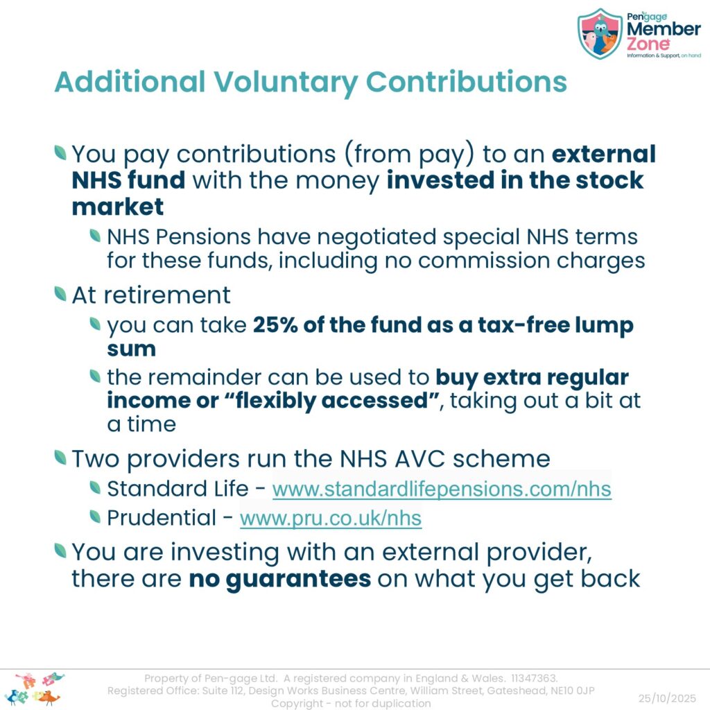 Outside of the 2015 Scheme, extra contributions that you can choose to pay to increase your future pension income, invested in the stock market (not guaranteed inflation-proof income), also known by its initials, AVCs