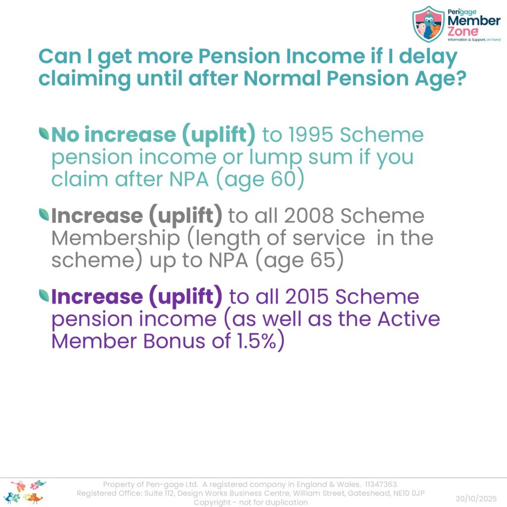 The 2008 Scheme and 2015 Scheme you can increase your pension by a Late Retirement Factor if you wait to claim until after Normal Pension Age